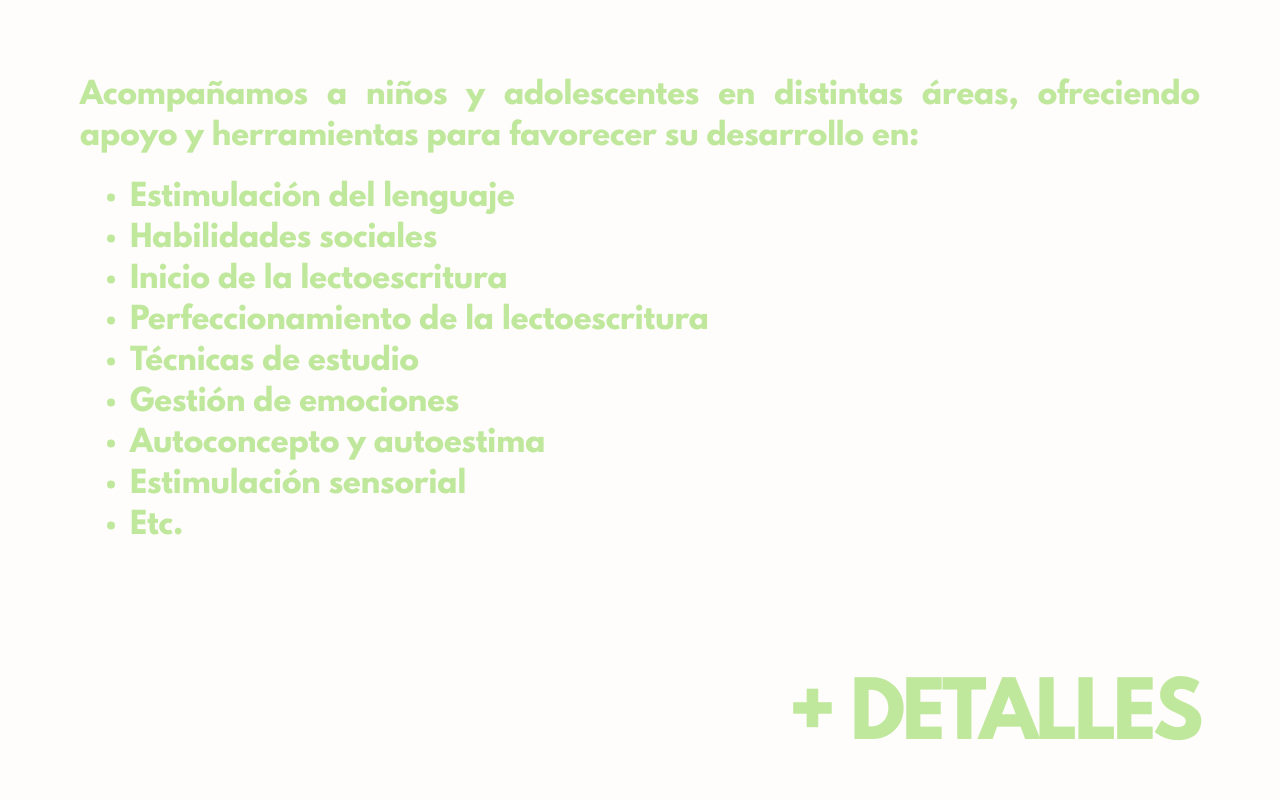 En los talleres englobaremos áreas en proceso de desarrollo, tanto si vuestro hijo presenta dificultades como si no, podrá disfrutar de nuestros talleres, donde se llevan a cabo actividades para trabajar sobre sus habilidades y recursos, que simplemente queremos reforzar y potenciar al máximo para lograr su mejor evolución y felicidad.
